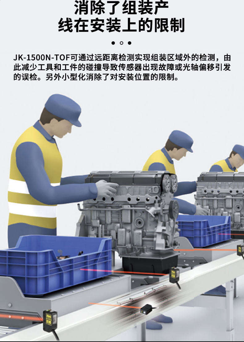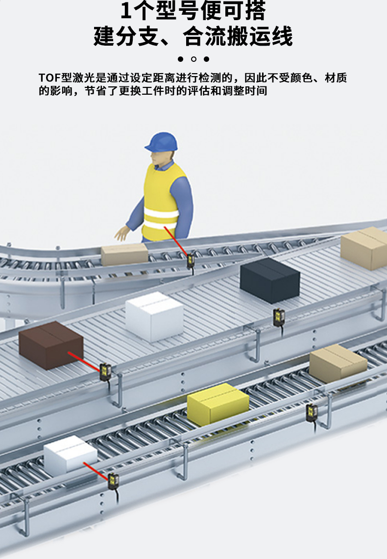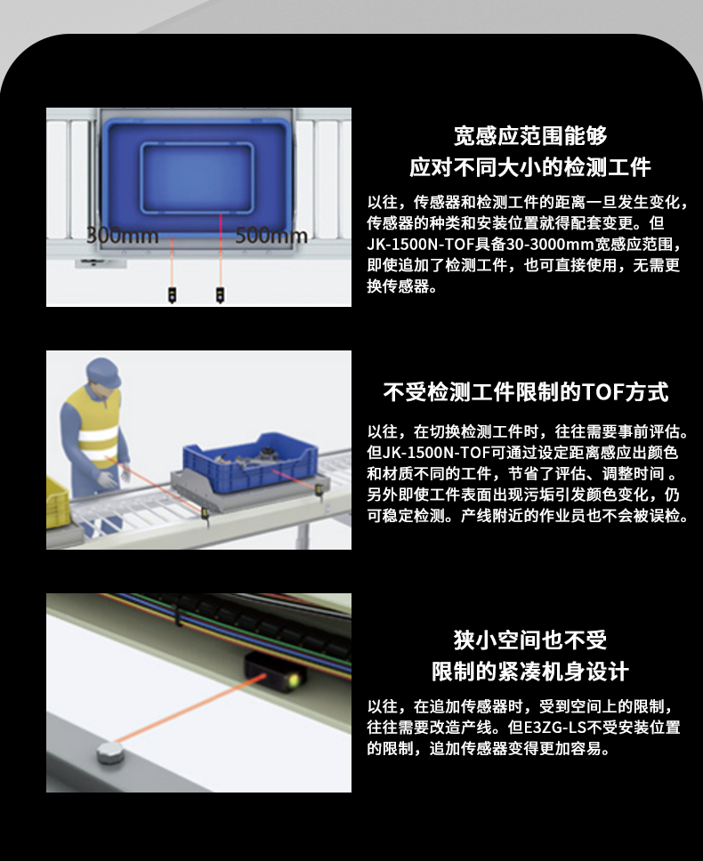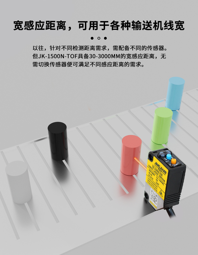 • 宽感应范围能够应对不同大小的检测工件,无需更换传感器。