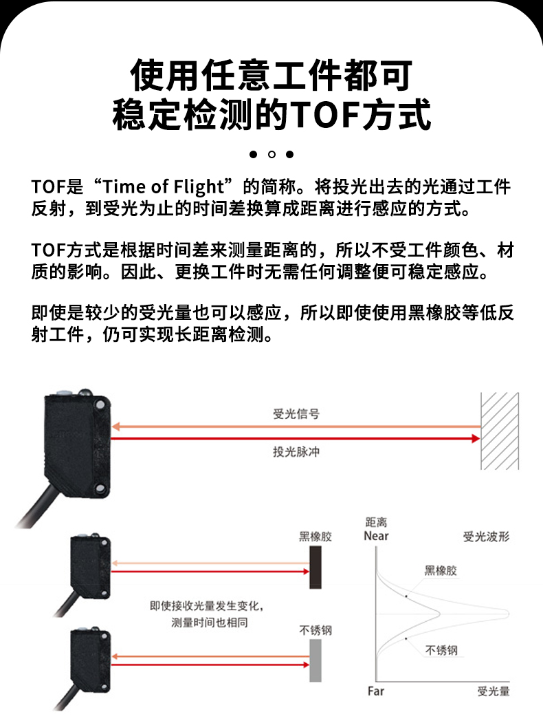 • 可通过设定距离感应出颜色和材质不同的工件。
